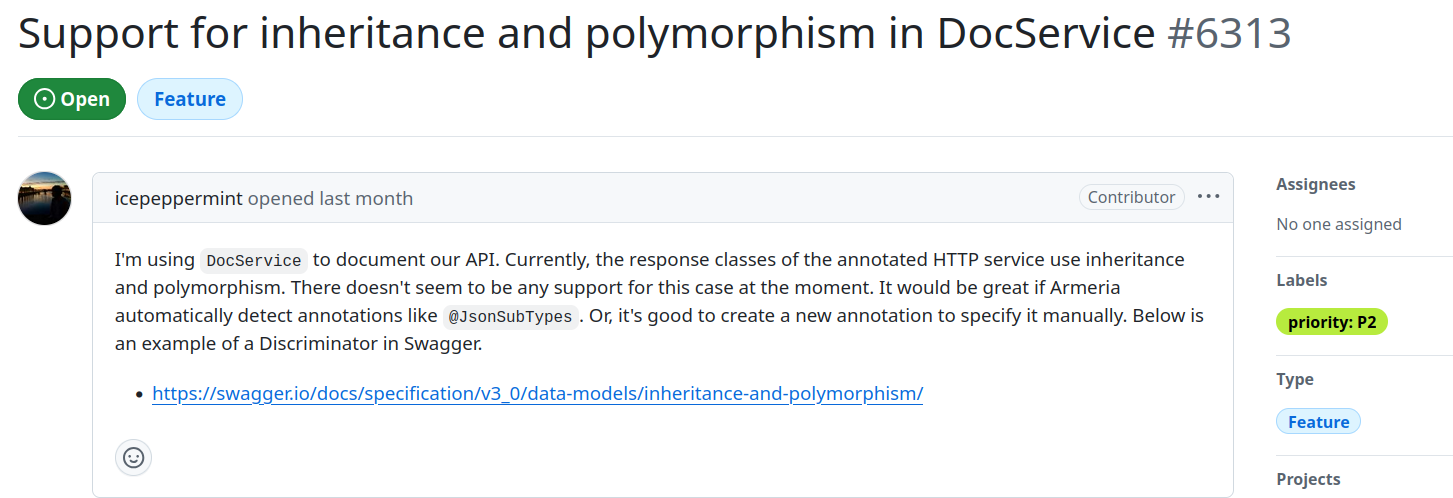 어느정도 각 API엔드포인트의 경로와 객체 속성정보를 보여주지만, 상속과 다형성에 관련된 정보가 없어서 이번에 기여해보고자 한다.