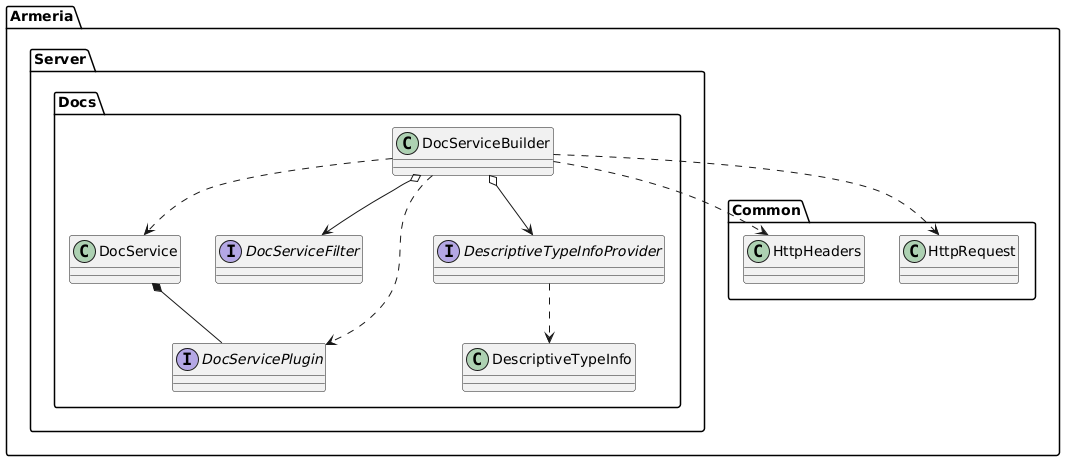 DocService라는 객체는 사용자가 개발한 API서버의 정보를 받아 문서화를 진행하는 대표 클래스이다. DocService 는 Builder패턴 으로 구성될 수 있는데, 이때 DocServiceBuilder가 DescriptiveTypeInfoProvider의 구현체를 입력받아 사용할 수 있다.