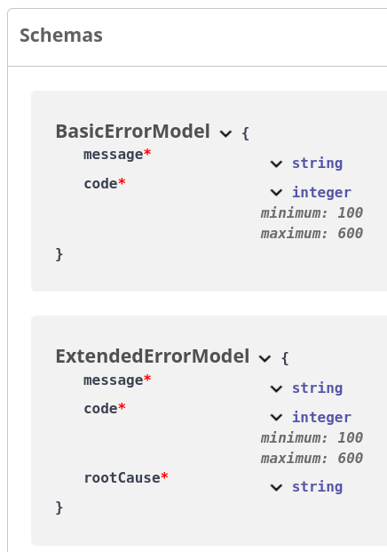 yaml과 비교해보면, ExtendedErrorModel은 message와 code가 없으나 allOf로 BasicErrorModel을 상속받아서 자동으로 그 속성들을 보여주고있다.