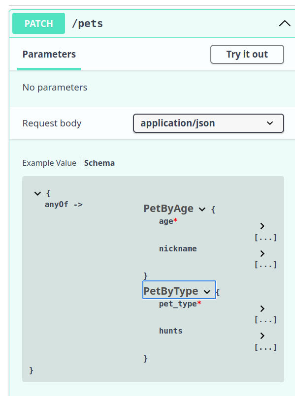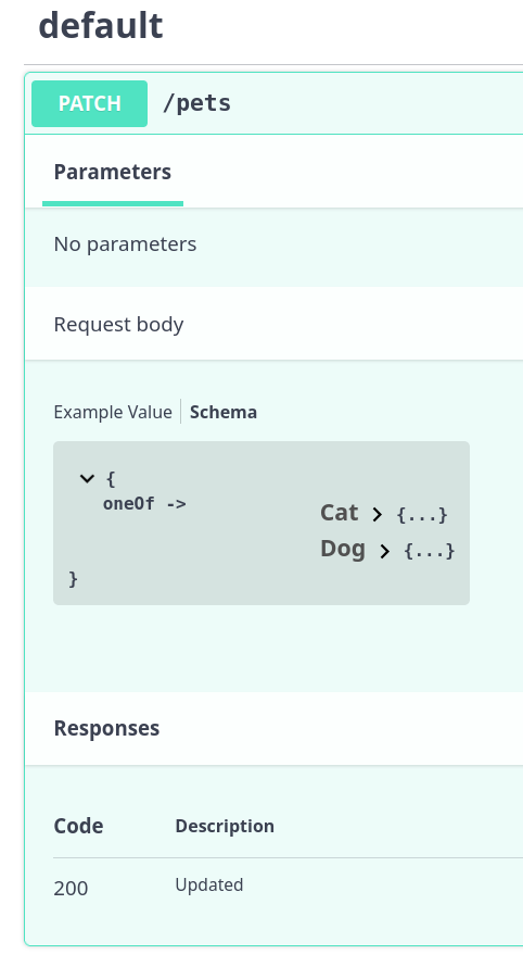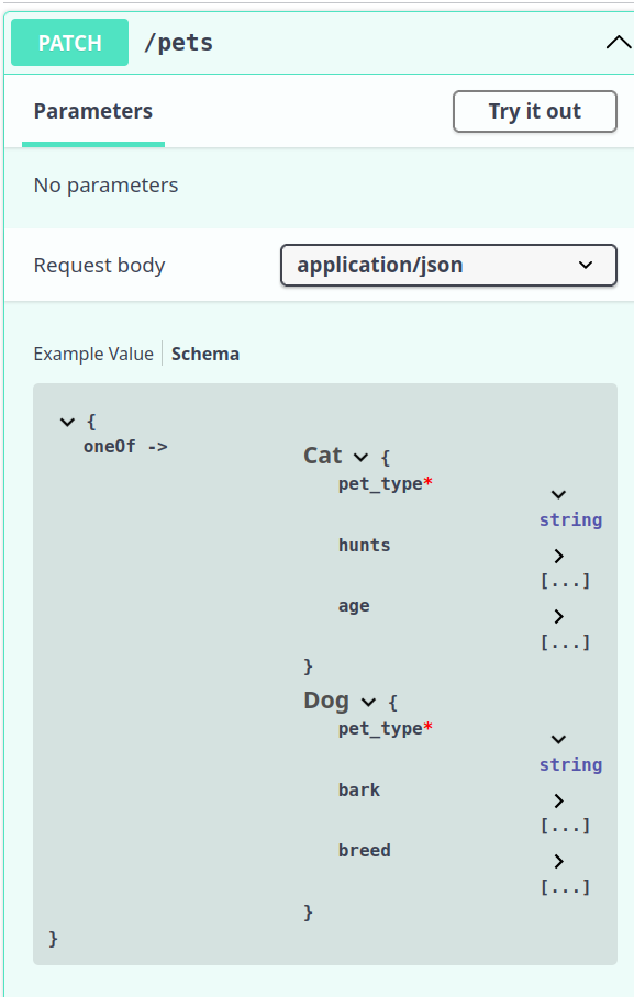 위 yaml은 /pets로의 patch메소드 요청에 대하여 어떤 스키마가 입력에서 들어가야 하는지 보여주는 문서를 만들기 위해 oneOf를 사용했다.